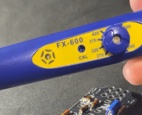 また、先端の温度を保つため作業時は常にクリーニングして酸化させずに光沢を保ってください。酸化していると上手く熱が伝わりませんので失敗します。 - はんだごてFX-600は安価な温度調整タイプ。約400℃と通常よりもやや高めに設定(コテ先によって変える)。そのうえでC型のこて先と組み合わせて素早く作業することで光沢感のある仕上がりになります。逆に作業が遅すぎるとフラックスがなくなって”いもはんだ”のような不良になるので要注意です。